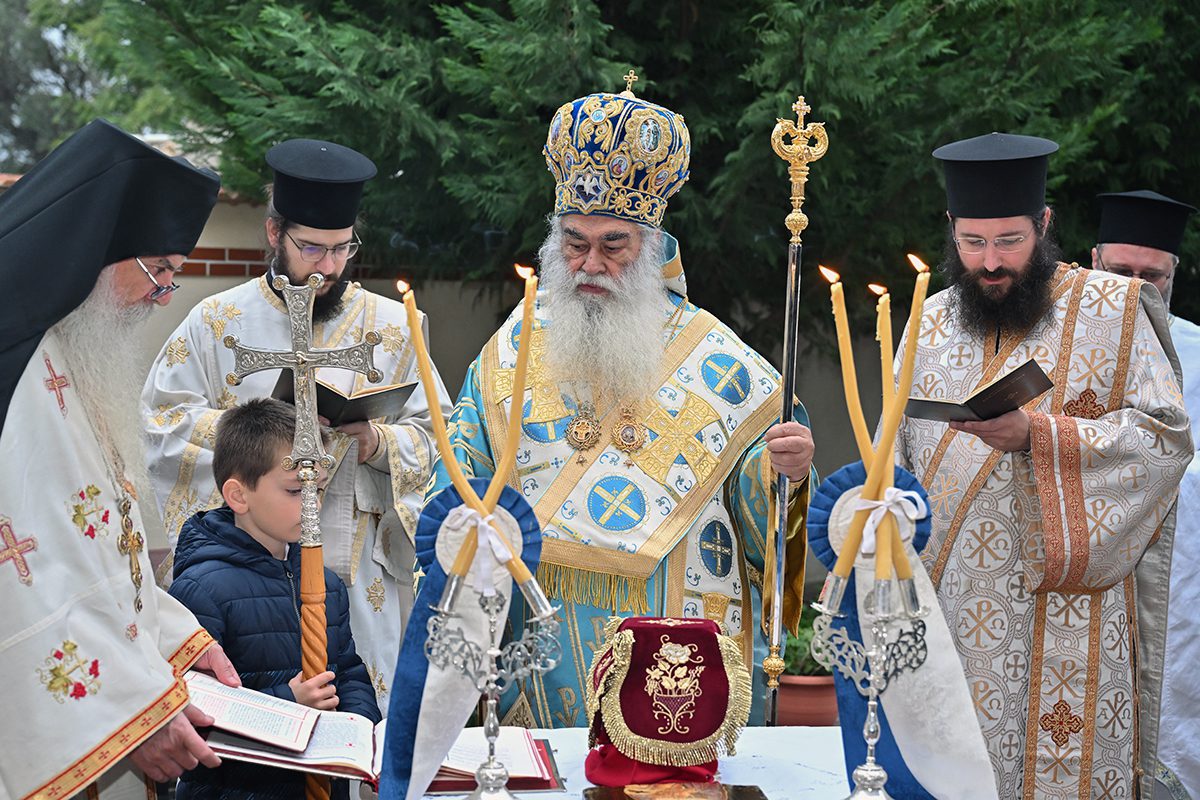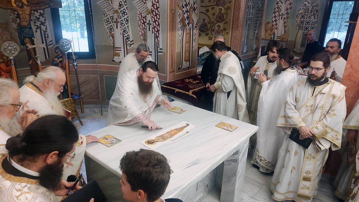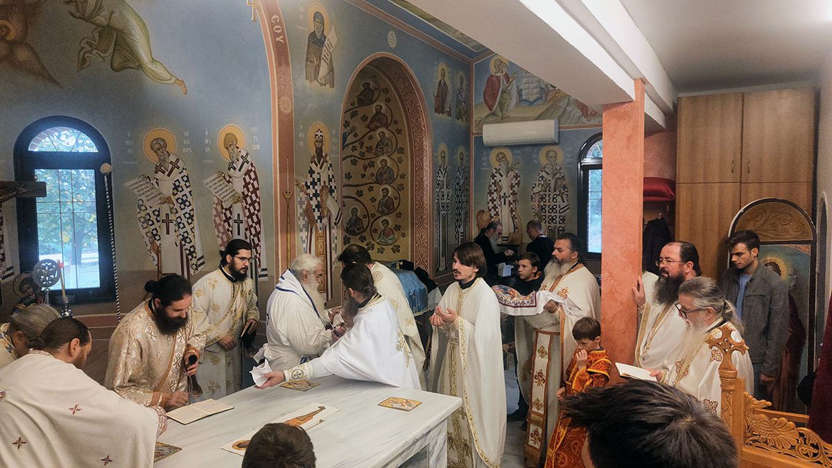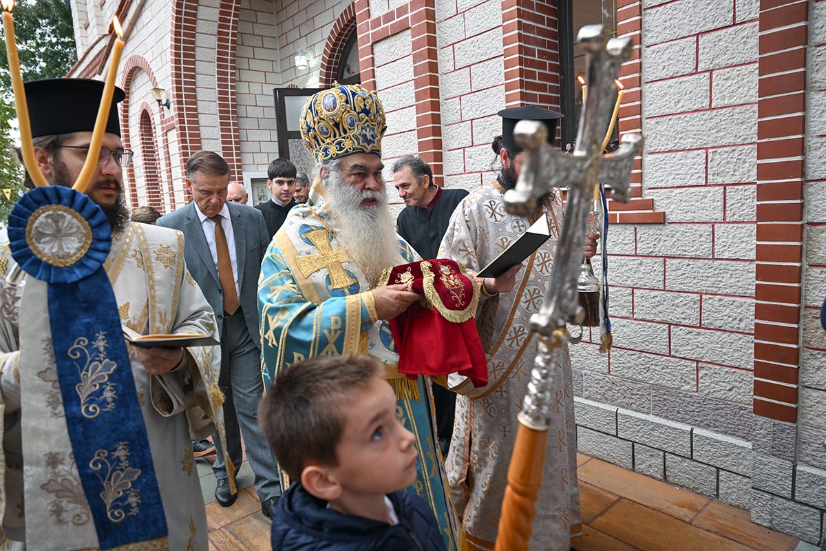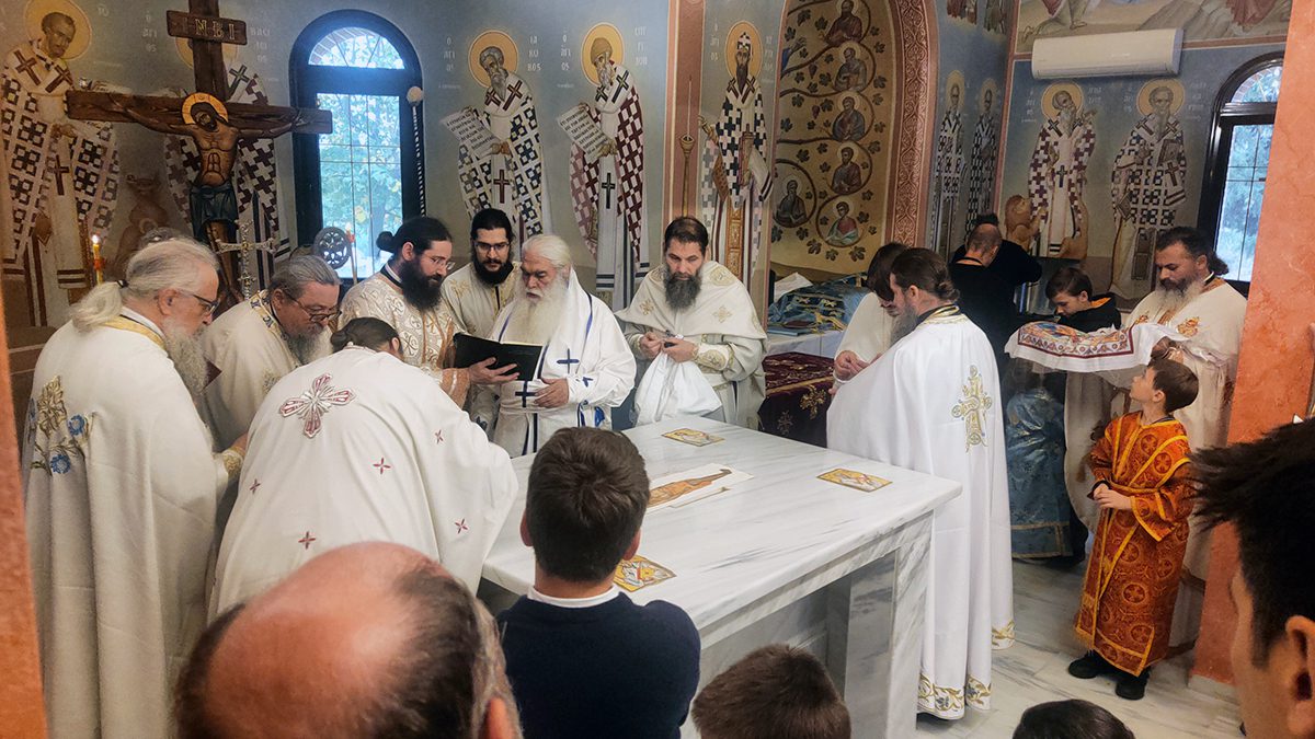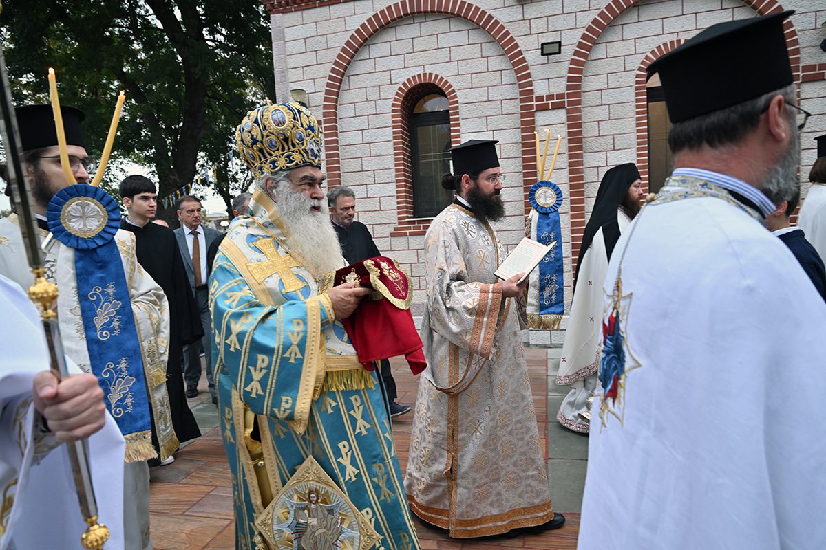 Κατά την καθορισμένη τάξη της Εκκλησίας, τελέστηκε ο Όρθρος και έγινε Λιτανεία γύρω από το Ναό. Ακολούθως δε ο Σεβασμιώτατος προέβη στην κατάθεση Αγίων Λειψάνων των Αγίων Ιγνατίου Θεοφόρου, Αγίου Χαραλάμπους και του Αγίου Παντελεήμονος στο κέντρο της Αγίας Τράπεζας, εν συνεχεία την έχρισε με το Άγιο Μύρο, τελώντας έτσι τον καθαγιασμό της και τέλος έγινε η ένδυση της Αγίας Τράπεζας με τα Ιερά Καλύμματα και τελέστηκε η πρώτη Θεία Λειτουργία στον εγκαινιασμένο πλέον Ιερό Ναό.