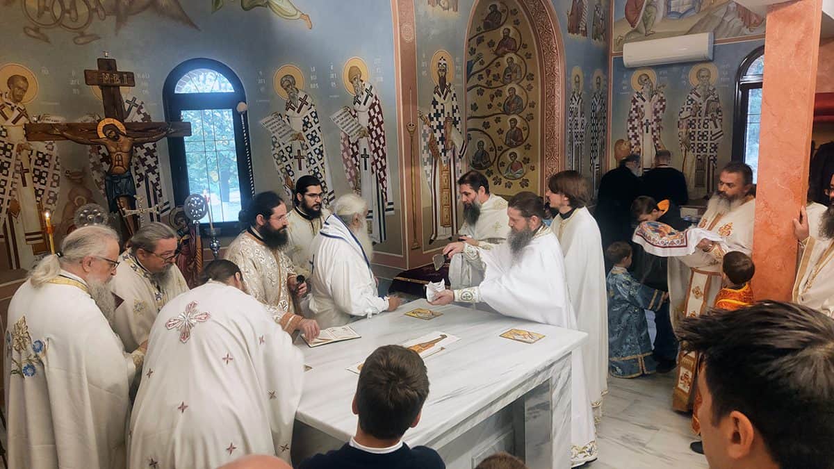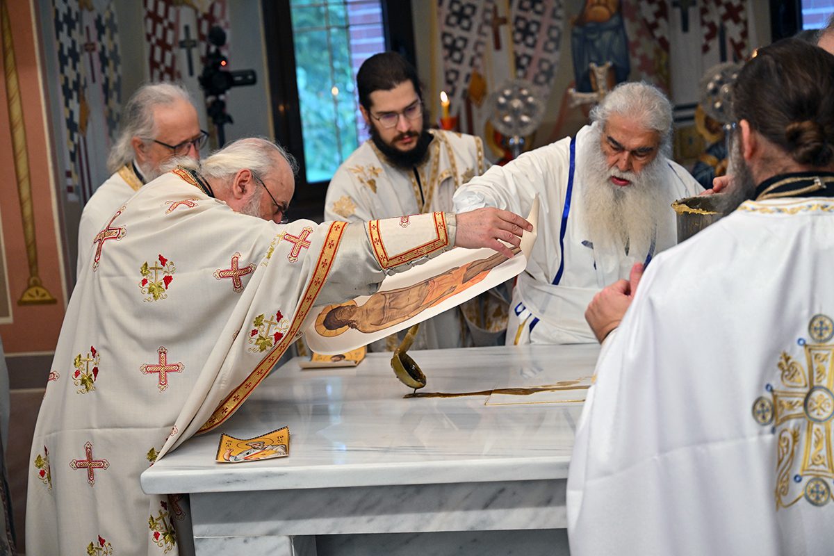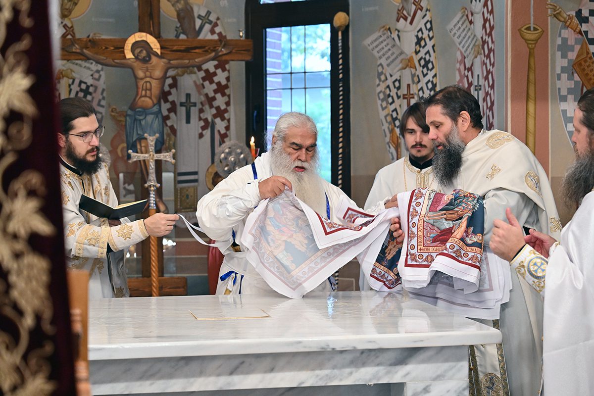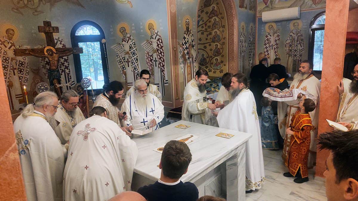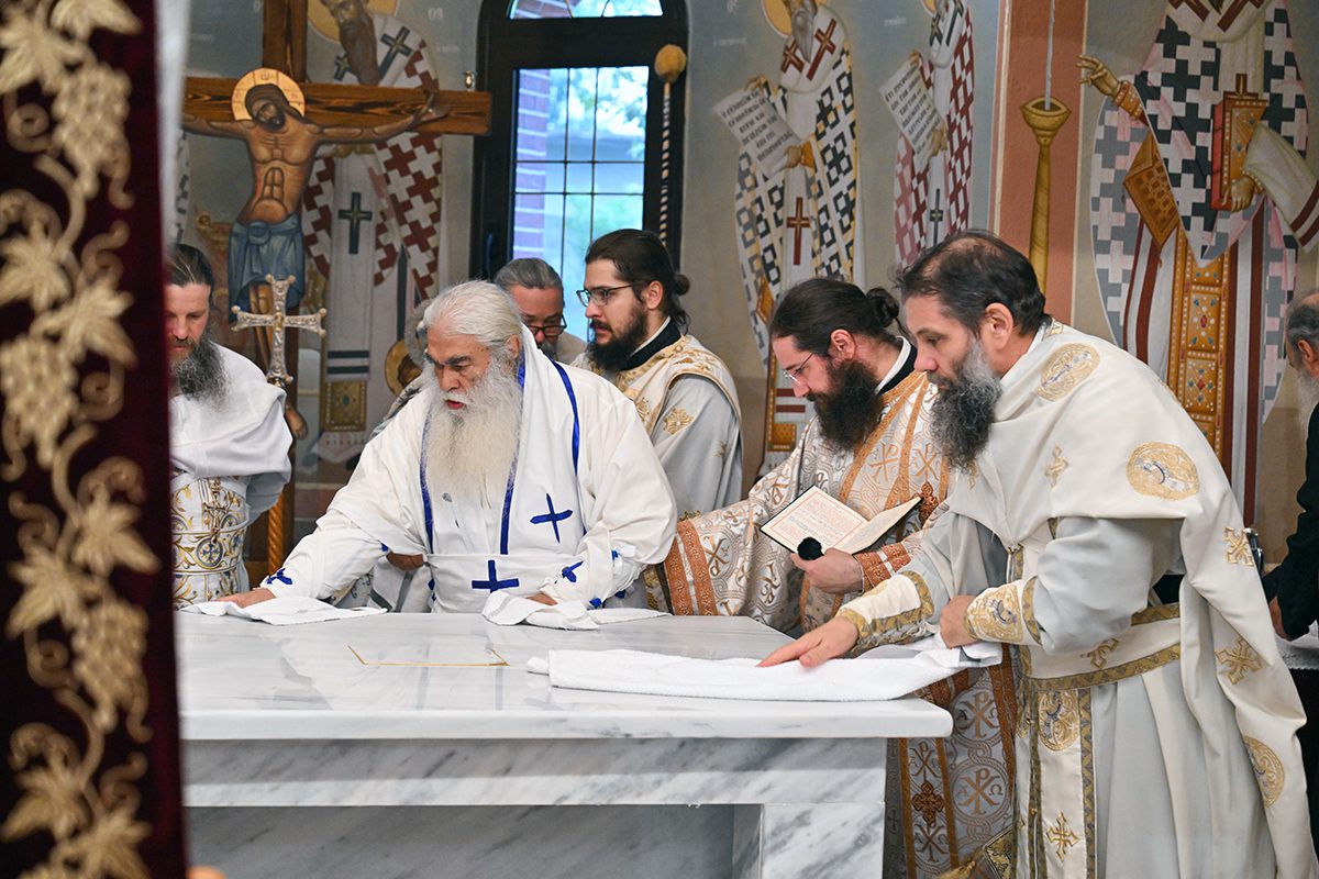 Κατά την καθορισμένη τάξη της Εκκλησίας, τελέστηκε ο Όρθρος και έγινε Λιτανεία γύρω από το Ναό. Ακολούθως δε ο Σεβασμιώτατος προέβη στην κατάθεση Αγίων Λειψάνων των Αγίων Ιγνατίου Θεοφόρου, Αγίου Χαραλάμπους και του Αγίου Παντελεήμονος στο κέντρο της Αγίας Τράπεζας, εν συνεχεία την έχρισε με το Άγιο Μύρο, τελώντας έτσι τον καθαγιασμό της και τέλος έγινε η ένδυση της Αγίας Τράπεζας με τα Ιερά Καλύμματα και τελέστηκε η πρώτη Θεία Λειτουργία στον εγκαινιασμένο πλέον Ιερό Ναό.