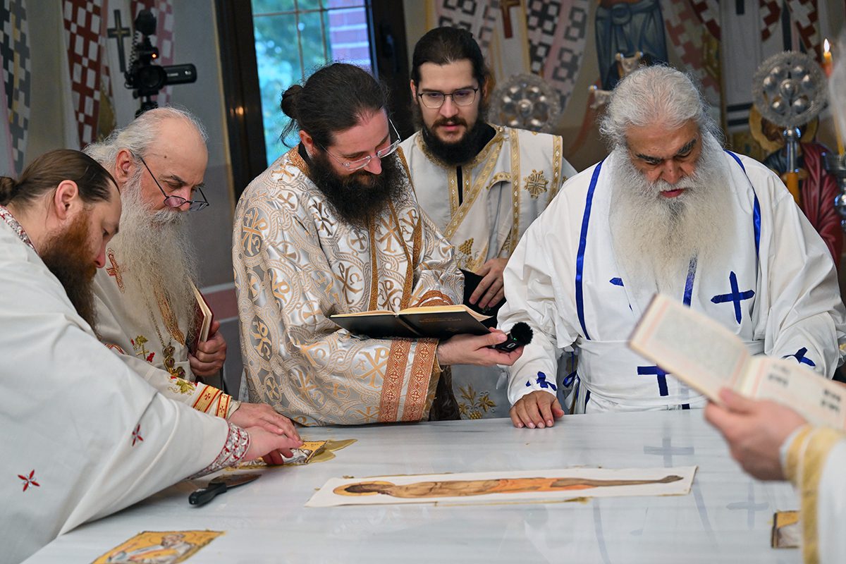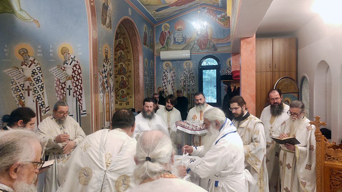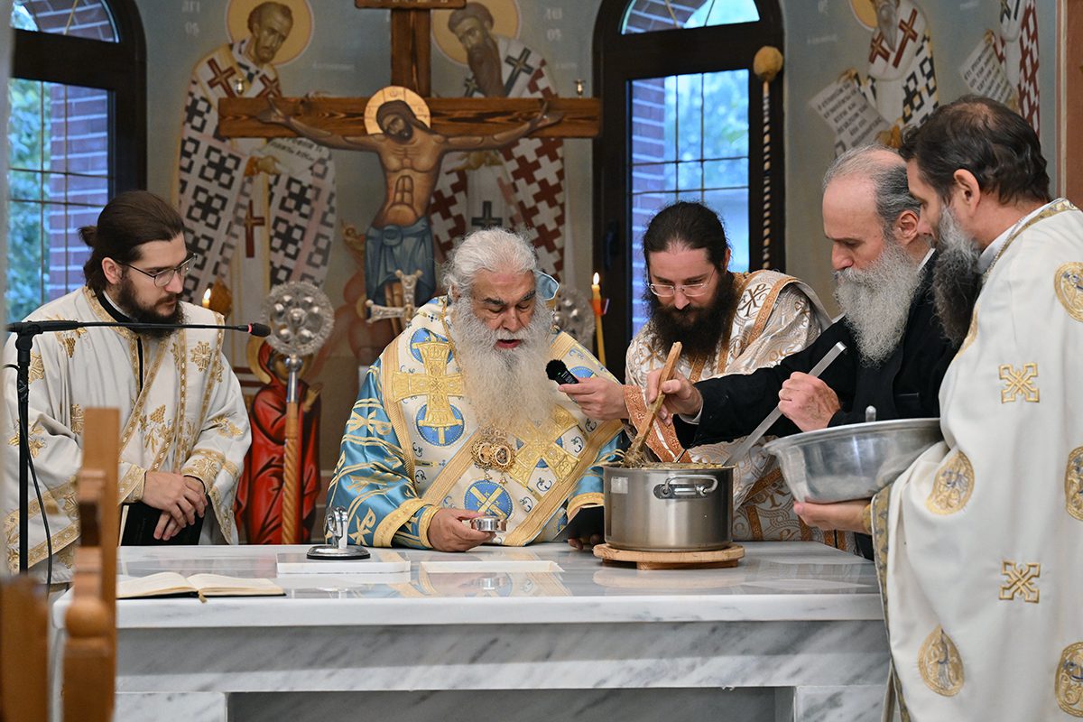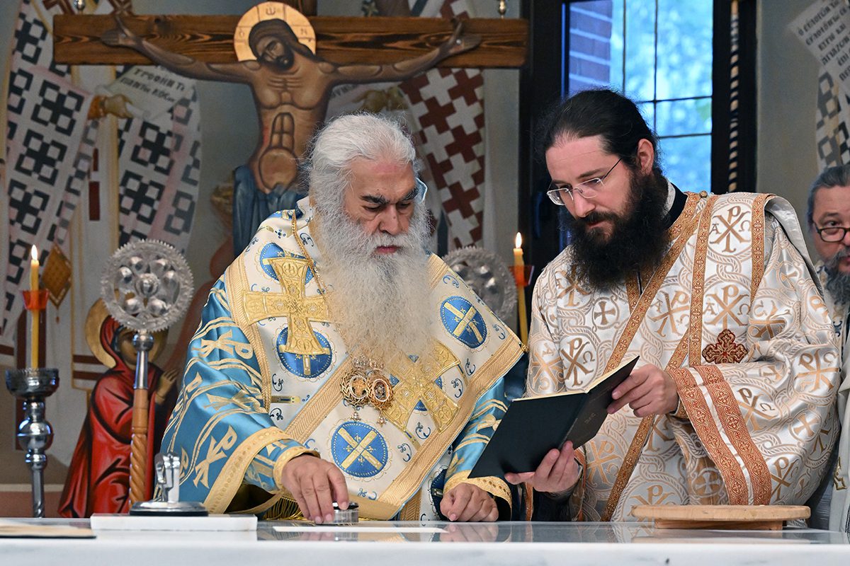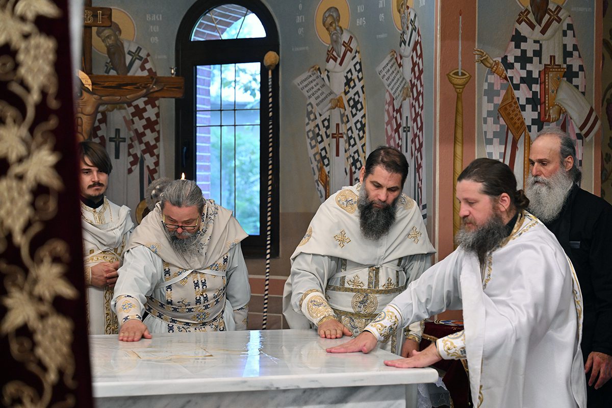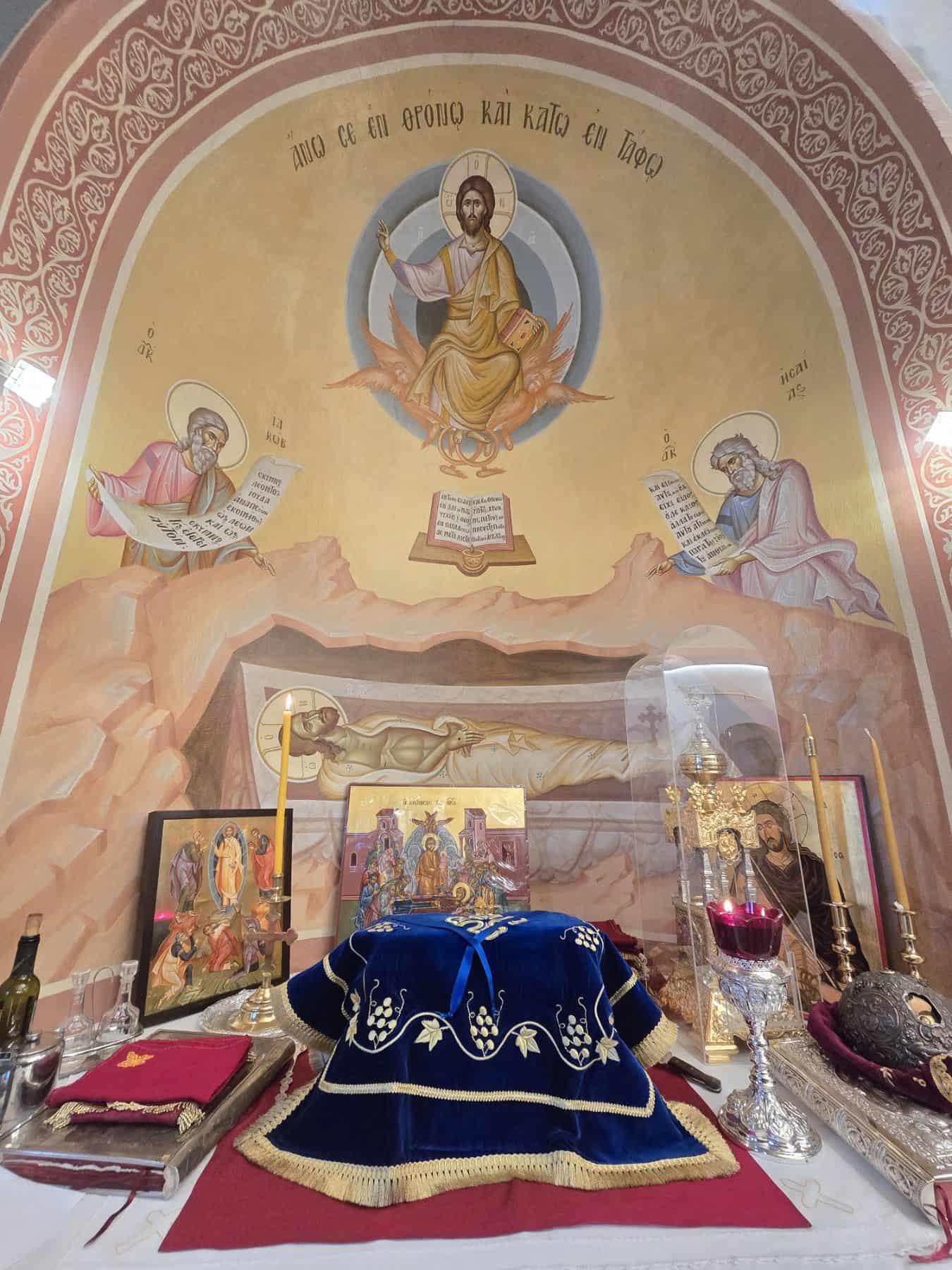 Κατά την καθορισμένη τάξη της Εκκλησίας, τελέστηκε ο Όρθρος και έγινε Λιτανεία γύρω από το Ναό. Ακολούθως δε ο Σεβασμιώτατος προέβη στην κατάθεση Αγίων Λειψάνων των Αγίων Ιγνατίου Θεοφόρου, Αγίου Χαραλάμπους και του Αγίου Παντελεήμονος στο κέντρο της Αγίας Τράπεζας, εν συνεχεία την έχρισε με το Άγιο Μύρο, τελώντας έτσι τον καθαγιασμό της και τέλος έγινε η ένδυση της Αγίας Τράπεζας με τα Ιερά Καλύμματα και τελέστηκε η πρώτη Θεία Λειτουργία στον εγκαινιασμένο πλέον Ιερό Ναό.