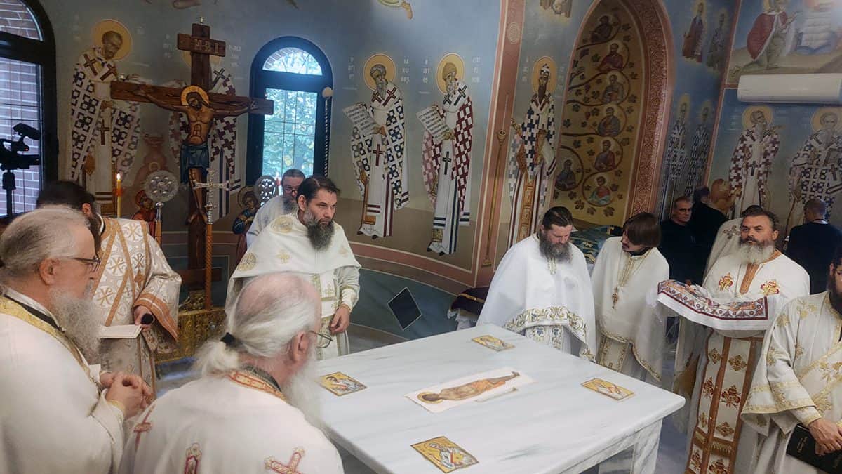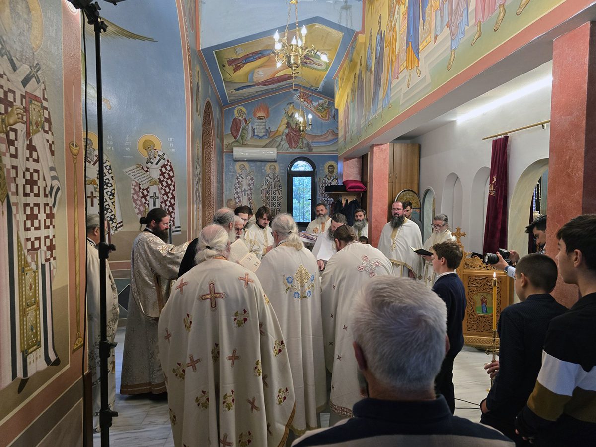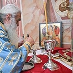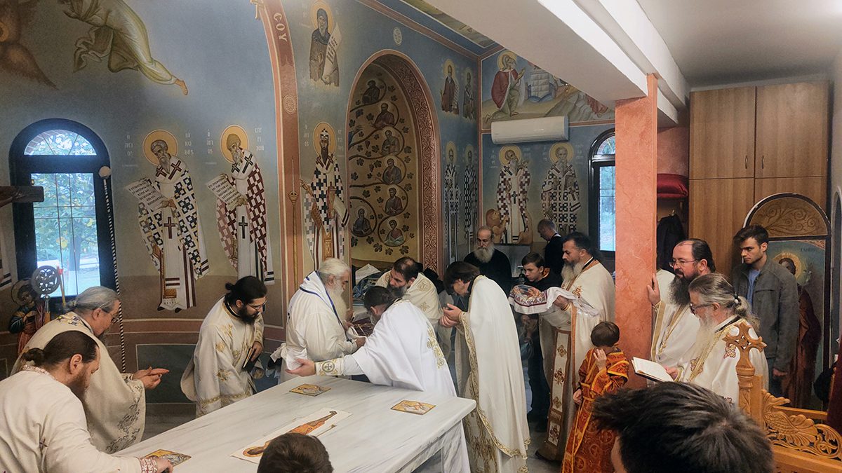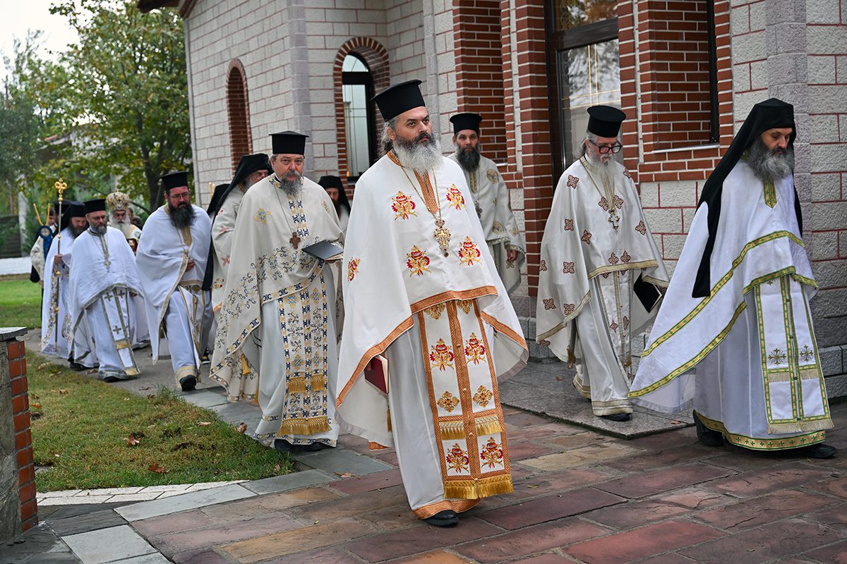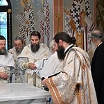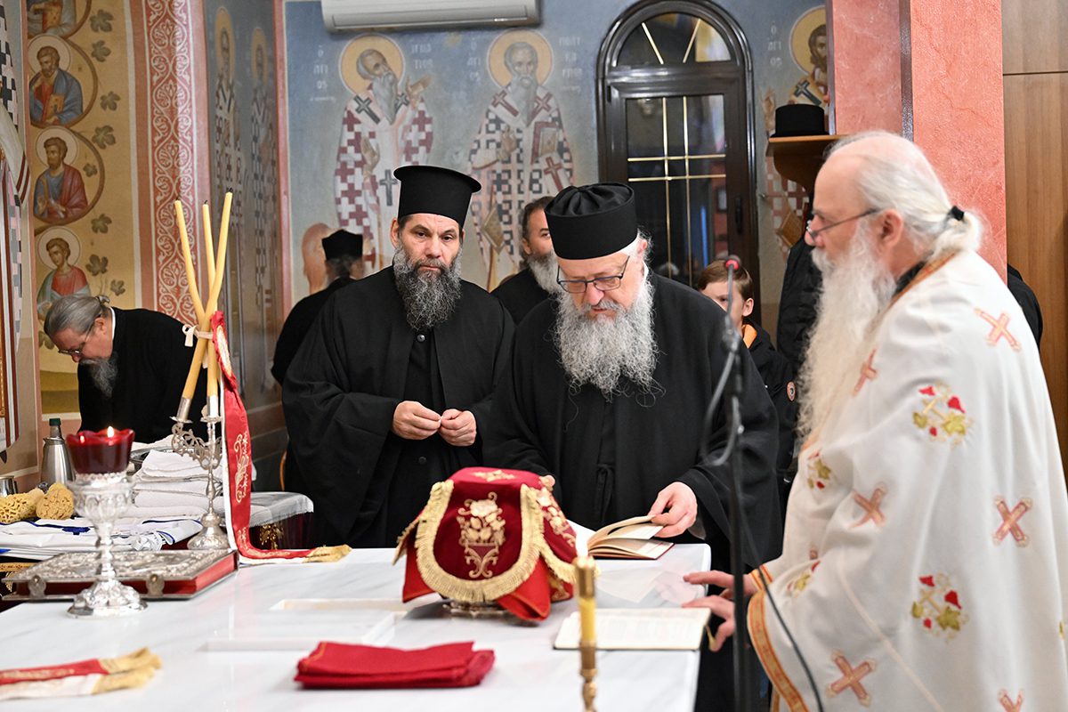 Κατά την καθορισμένη τάξη της Εκκλησίας, τελέστηκε ο Όρθρος και έγινε Λιτανεία γύρω από το Ναό. Ακολούθως δε ο Σεβασμιώτατος προέβη στην κατάθεση Αγίων Λειψάνων των Αγίων Ιγνατίου Θεοφόρου, Αγίου Χαραλάμπους και του Αγίου Παντελεήμονος στο κέντρο της Αγίας Τράπεζας, εν συνεχεία την έχρισε με το Άγιο Μύρο, τελώντας έτσι τον καθαγιασμό της και τέλος έγινε η ένδυση της Αγίας Τράπεζας με τα Ιερά Καλύμματα και τελέστηκε η πρώτη Θεία Λειτουργία στον εγκαινιασμένο πλέον Ιερό Ναό.