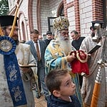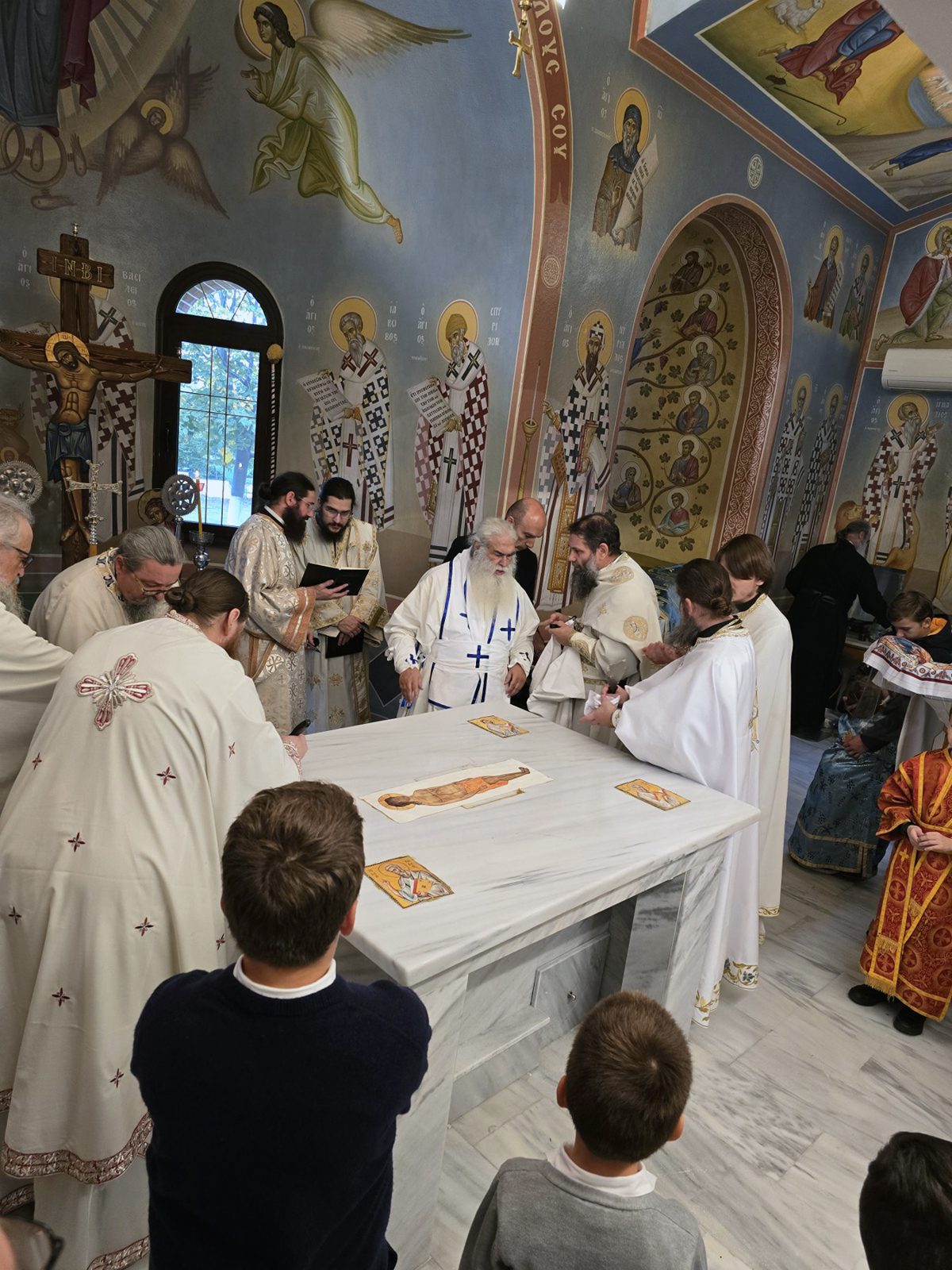 Στην ακολουθία του Όρθρου, την Τελετή των Εγκαινίων και την πανηγυρική πρώτη Θεία Λειτουργία, επί της νεοεγκαινιασθείσης Αγίας Τραπέζης, προεξήρχε ο Σεβασμιώτατος Μητροπολίτης Γουμενίσσης, Αξιουπόλεως και Πολυκάστρου κ. Δημήτριος, πλαισιούμενος από ιερείς της Ιεράς Μητροπόλεως και τον εφημέριο του Ναού, π. Ιουλιανό.