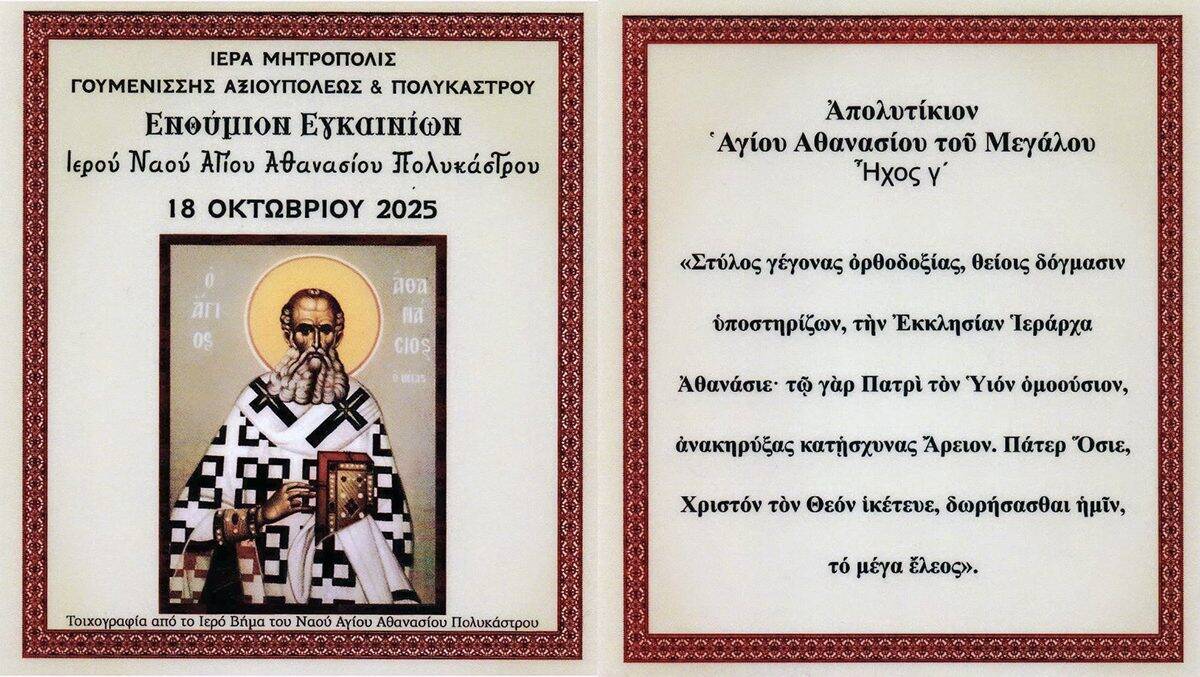 Είθε ο Άγιος Αθανάσιος, προστάτης της ενορίας μας, να πρεσβεύει αδιαλείπτως υπέρ πάντων ημών και να μας ενισχύει στην πορεία της πίστεως και της σωτηρίας.